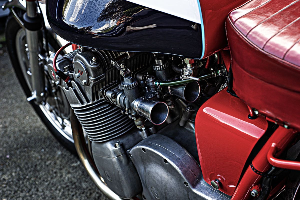 Revenons à la fin des années 60, en 1969 plus précisément. La marque remporte un énorme succès au Salon de la moto de Milan, en lançant ce nouveau modèle dont la production débute en 1971. Cette MV Agusta exploite la technologie “Grand Prix” de l’époque, laquelle implique des engrenages coûteux pour entraîner les arbres à cames, les roulements à rouleaux et les cales. Alimentée par une rampe de carburateurs Dell’Orto, la mécanique gronde solidement. Le réservoir d’huile, intégré à l’avant du quatre cylindres, contient près de cinq litres de lubrifiant ; et c’est finalement la seule différence entre le moteur de la 750 S et celui des machines de compétition. Cependant sa transmission est sans doute ce qui est le plus admirable ici : boîte, cardan et pont ; l’assemblage de ces éléments constitue ni plus ni moins qu’un véritable chef d’œuvre.