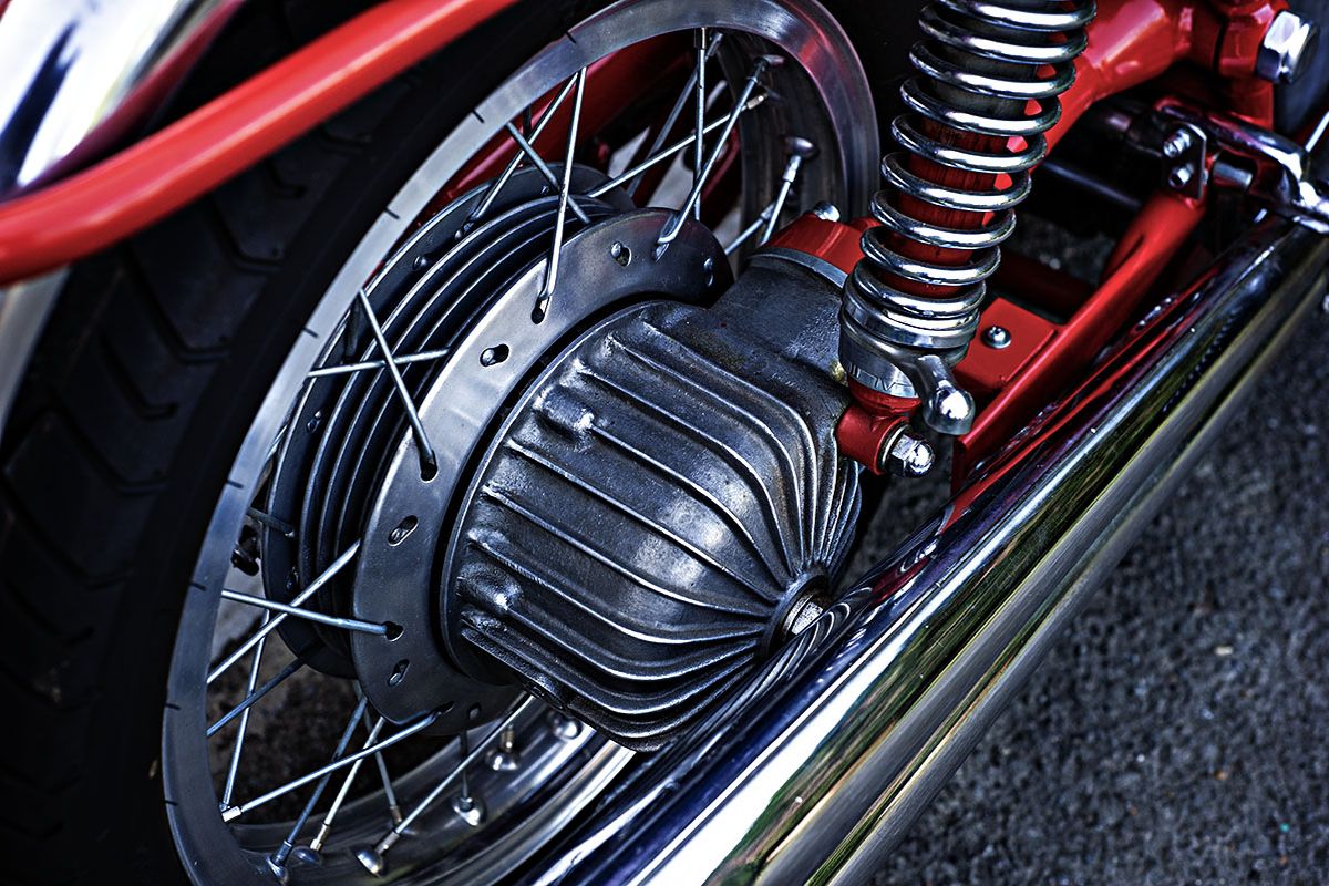 Let’s go back to the late 60s ; 1969 to be exact. MV Agusta made a huge splash at the Milan Motorcycle Show by unveiling this new model, with production beginning in 1971. This MV Agusta drew upon “Grand Prix” technology of the time, including costly gear-driven camshafts, roller bearings and precision shims. Fed by a rail of Dell’Orto carburetors, the engine delivers a solid growl. The oil tank, integrated into the front of the inline-four, holds nearly five liters of lubricant ; and that’s really the only difference between the 750 S engine and its racing counterparts. However, its drivetrain may be the most admirable feature of all : gearbox, driveshaft, and final drive ; the assembly of those components is nothing short of a mechanical masterpiece.